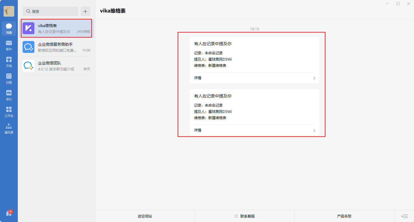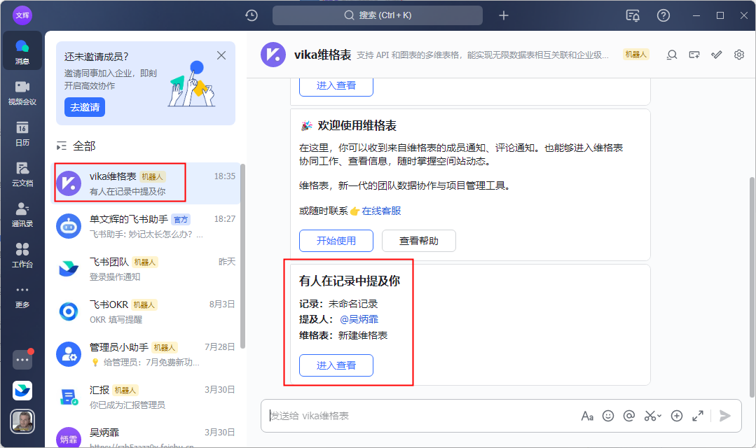 如果您的维格表是在钉钉、企微、飞书应用市场添加的应用,还可以收到IM自带的通知,效果如下: