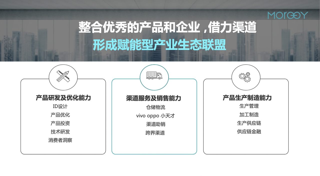 为了减轻信息差给上下游企业带来的痛苦, 我们拿下了国内最大的 3C 生态链整合工作 ,品牌方在摩乐吉可以找到单个品类最优质的产品、我们会用最优质的供应商为客户生产智能硬件、甚至渠道助销和供应链金融都可以在摩乐吉完成。