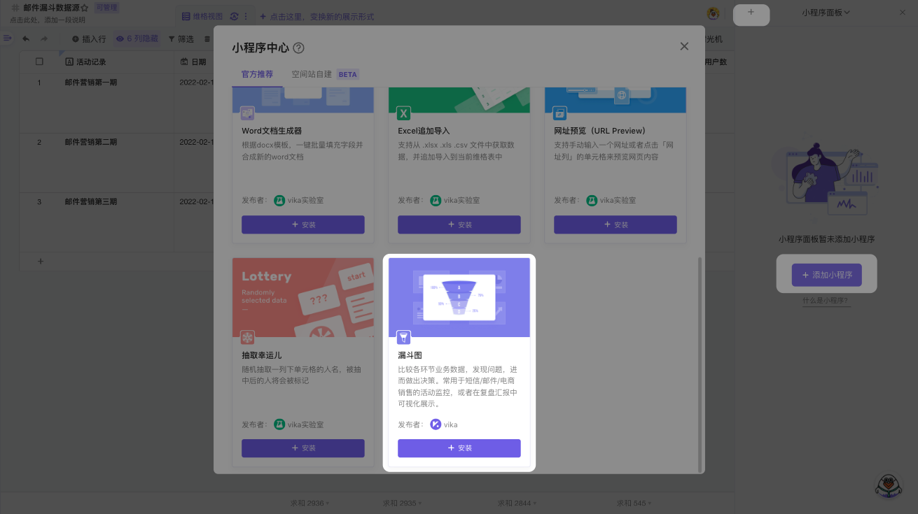 打开「小程序中心」选择安装一个「漏斗图」。
