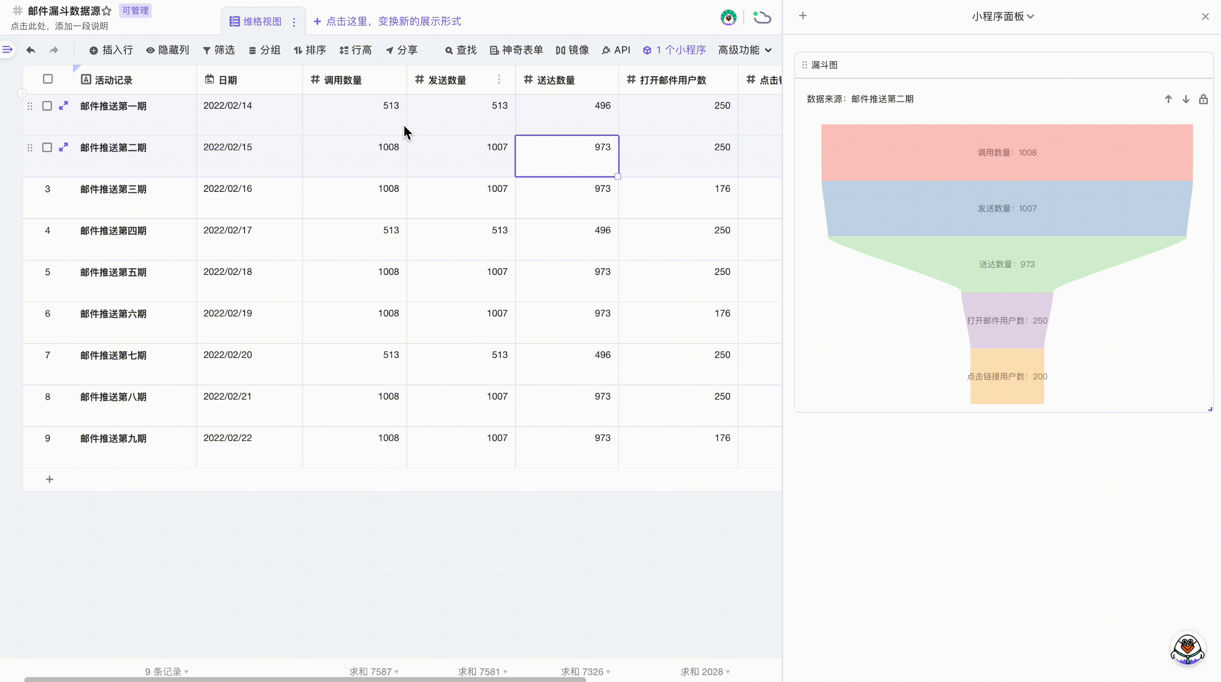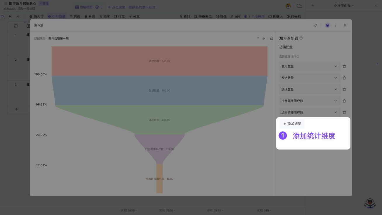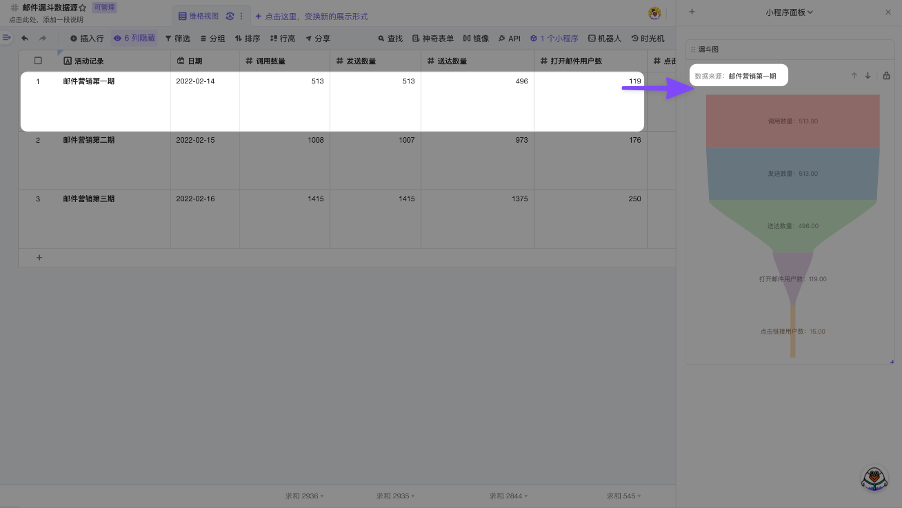 你可以点击单元格,系统会将该行记录渲染为漏斗图;你也可以框选多行,系统会多行数据求和后渲染成漏斗图。
