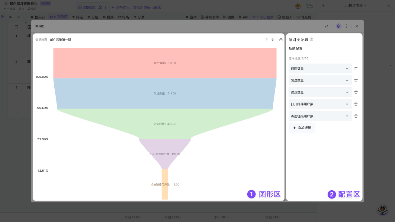你可以在配置区中添加维度(上限为 10 个),系统会按照从上到下的顺序读取你维度中的数值,然后按照数值的比例大小渲染为一个梯形的漏斗图。