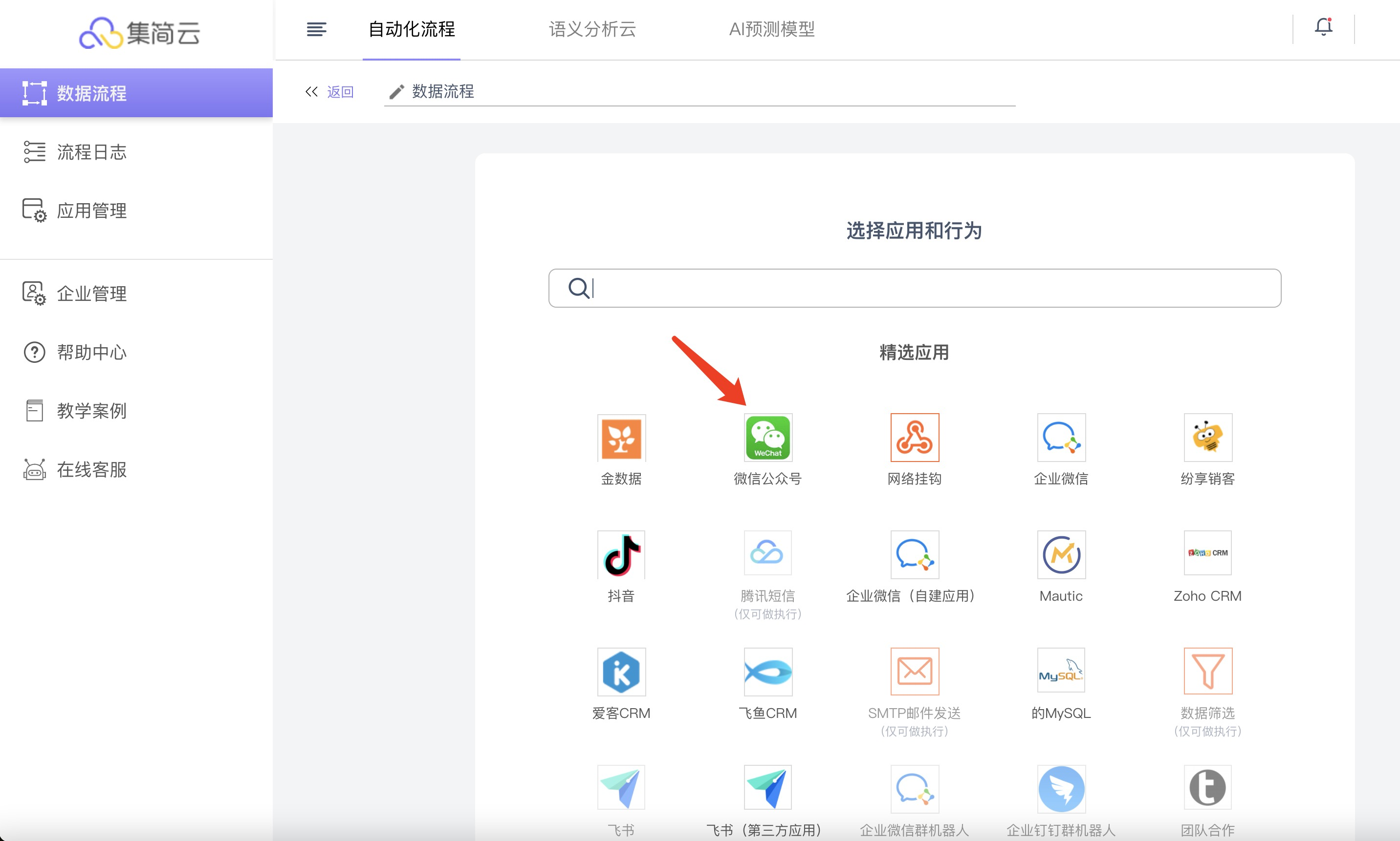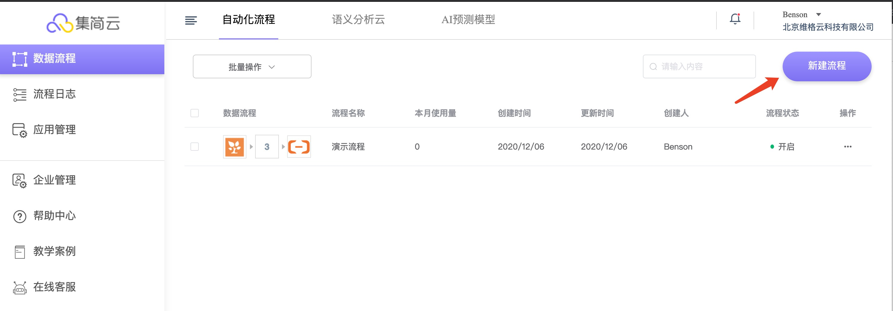 - 登录成功后,打开集简云管理平台,选择【自动化流程】--【数据流程】--【新建流程】
