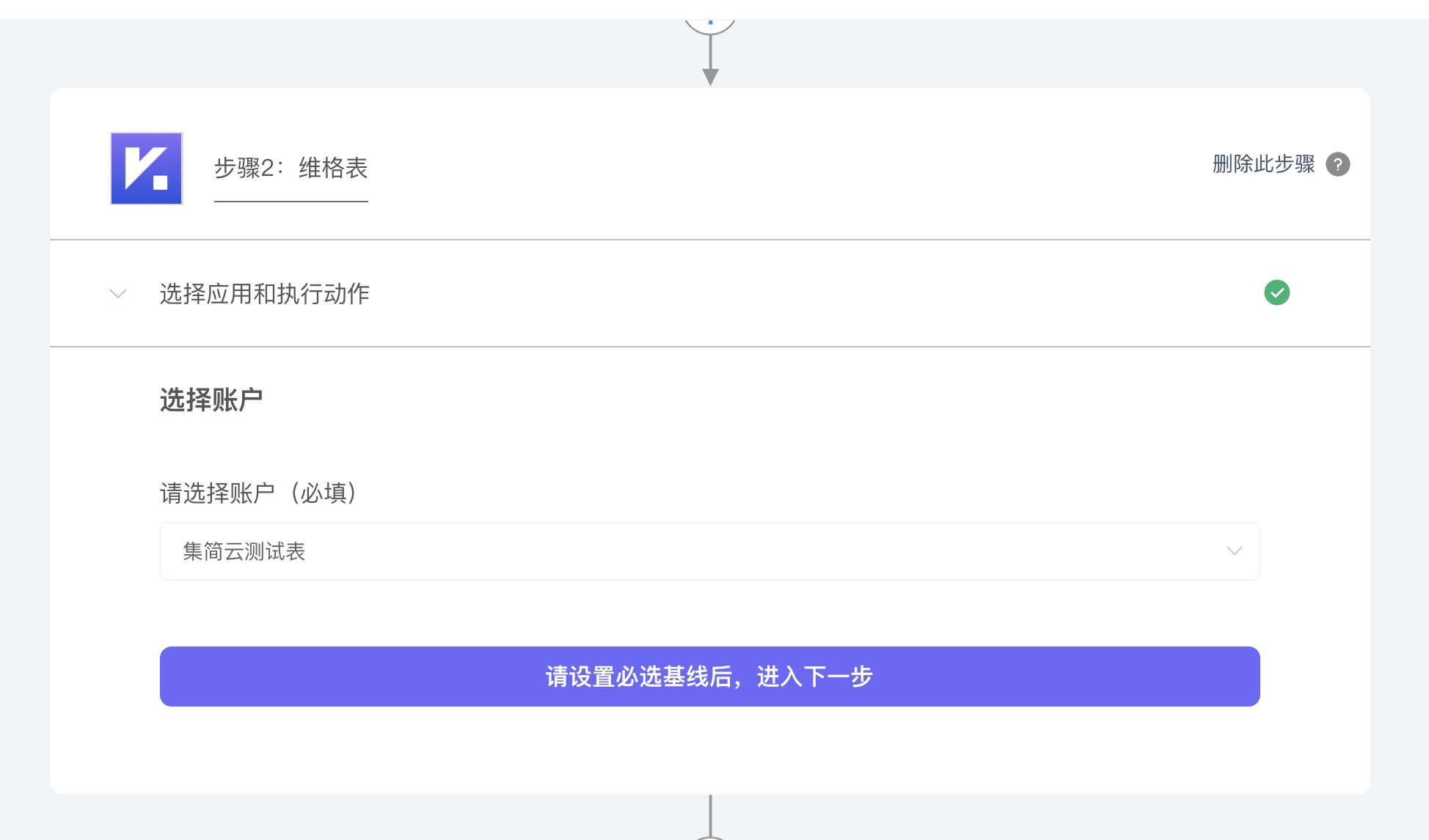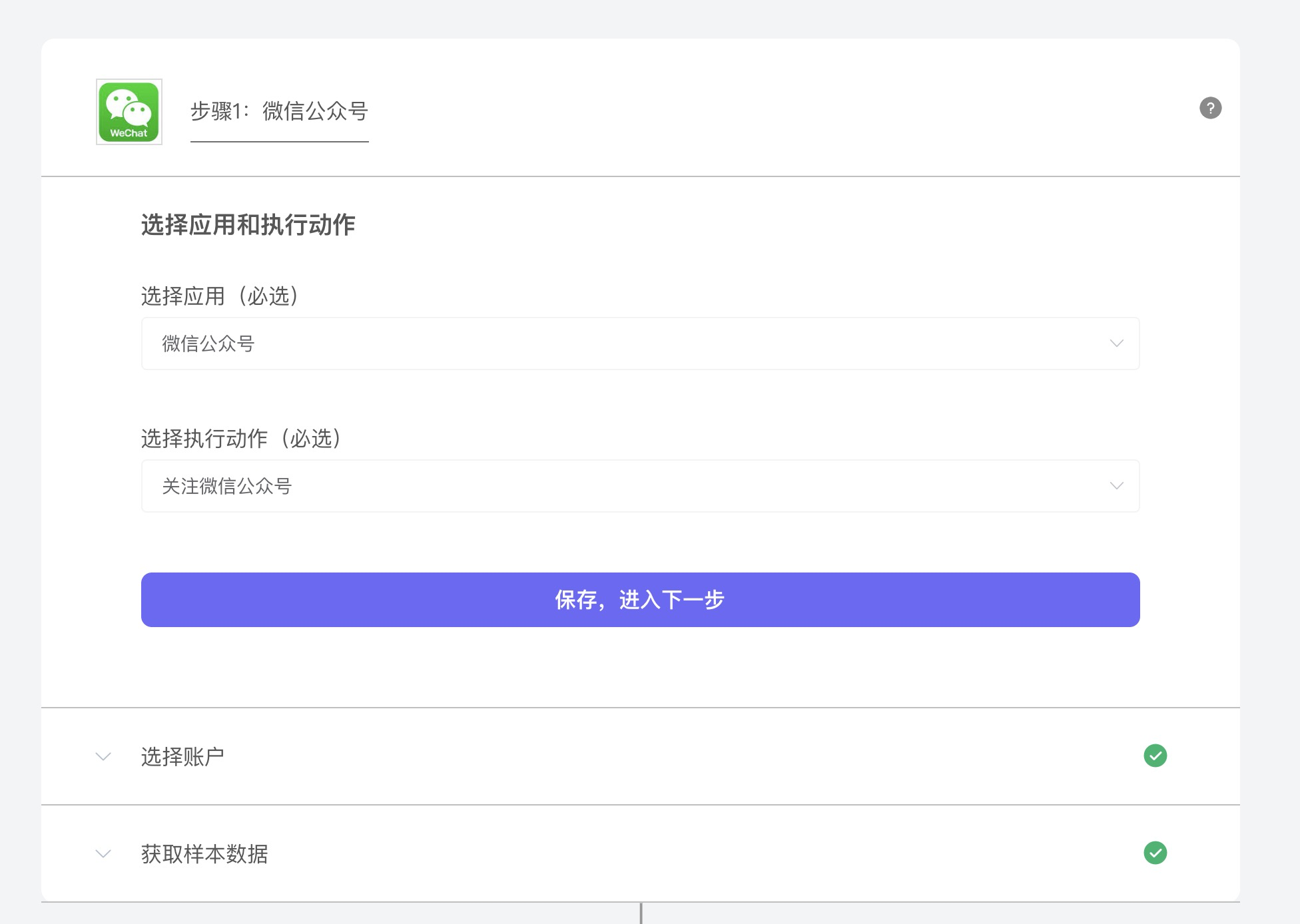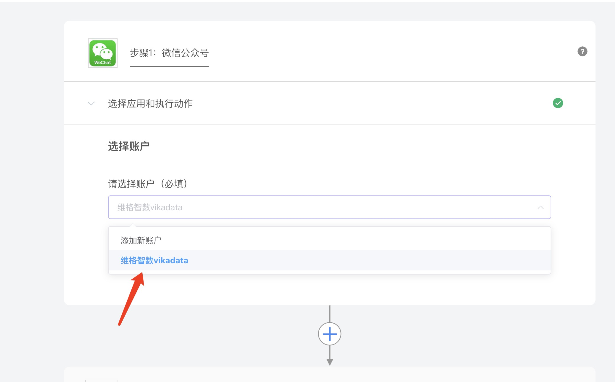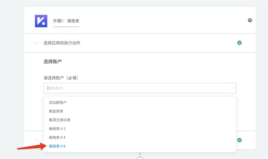 - 第二步:【选择执行应用】--【选择账户】--【选择动作】,例如:同步新增数据到维格表的【公众号关注用户表】