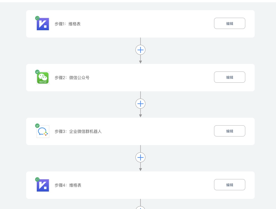 当维格表有新数据添加时,同步推送微信公众号模版消息,推送企业微信群消息通知,最后更新维格表中的推送状态