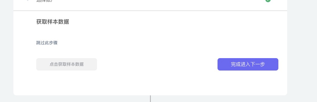 - 点击【获取样本数据】,即获取数据表中第一行记录的数据,以便下一个应用选择匹配字段,完成进入下一步