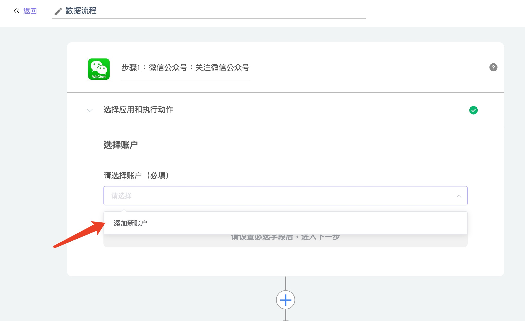 - 第一步:【选择触发应用】--【选择动作行为】--【选择应用账户】,例如:当有新用户【关注微信公众号】时,自动触发并执行下一个数据流