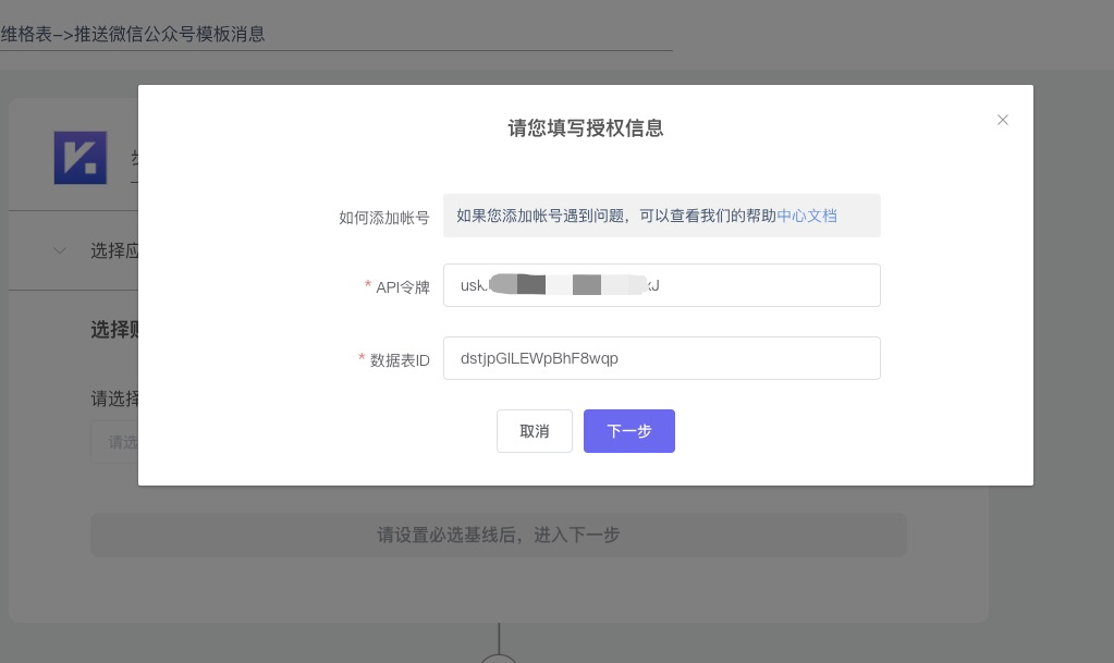 - 选择【添加帐号】,填写【API Token】和【数据表ID】,选择添加的维格表并保存(下拉框最后一个,表名可在左侧菜单【应用管理】修改)