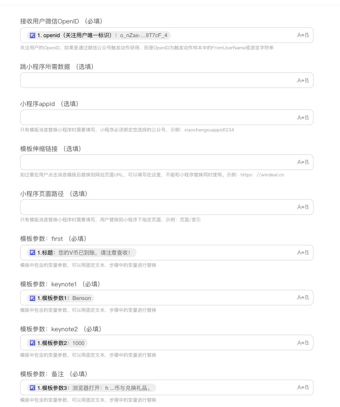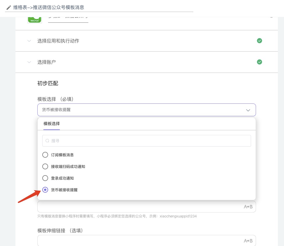 - 选择公众号已准备好的【模板消息】(如果您尚未添加模版消息,请先在公众号管理后台进行添加)